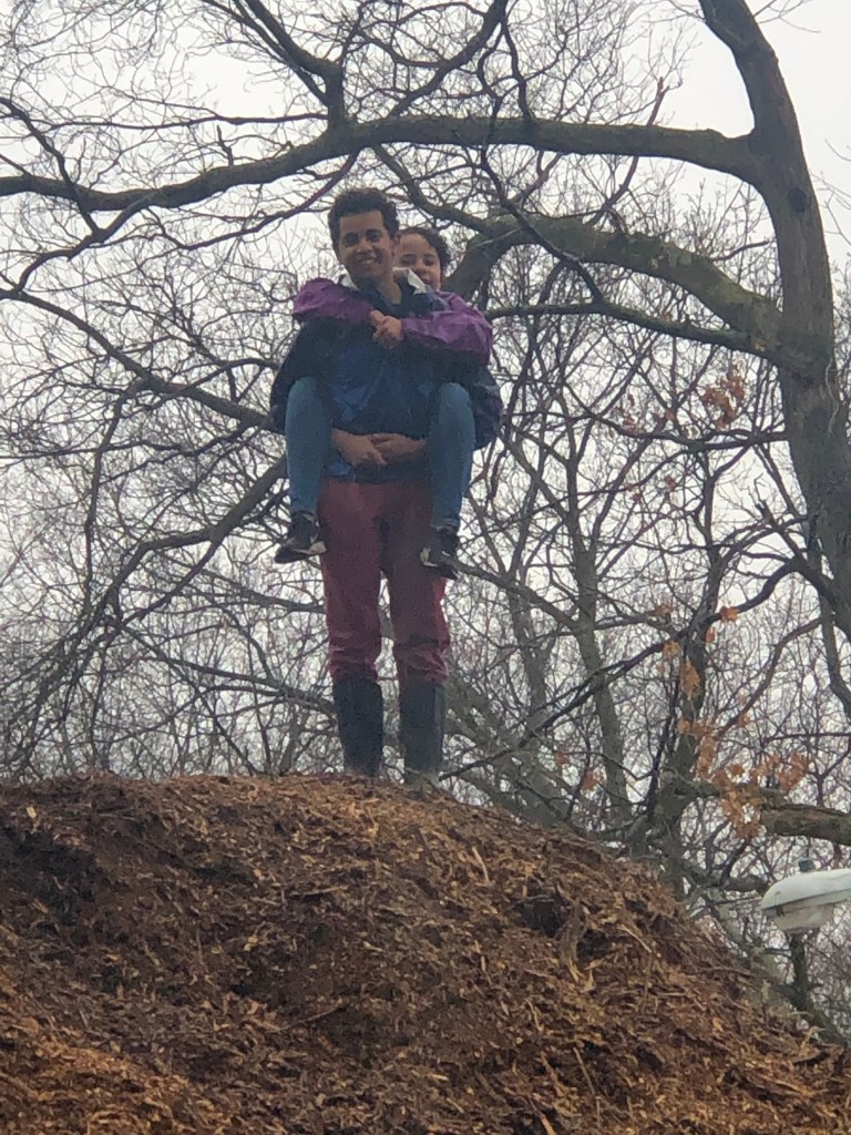 Our third day found us at another city park that is a little more rustic. We frequent this park because of it’s wooded overhang around the edge of a life filled lake. It began to rain as we started out, but we came prepared with raincoats and lots of towels in the car to dry off on afterwards. Gabriel conquered a very high tree stump. We were all victorious in ascending a mountain of wood chips, yes, even me. As I climbed I was reminded about a previous post I wrote about the importance of risk-taking. When my kids asked me to come to the pile with them my first response was no, but they persisted and I decided to push myself out of my comfort zone. I was pleasantly surprised at how empowered I felt arriving at the top. And even as I half walked half slid on my way down I felt pride. Gabriel and Sylvia leaped and ran around on the top of the mountain for at least 40 minutes while I videoed and inspected all that was around me on the bottom. Noel spent her time running up and down from the kids to me splashing mud and getting covered in dirt and wood chips.
